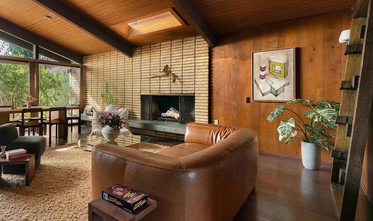 Sited off a private street and gated driveway, on a hilltop parcel spanning a third of an acre with picturesque views stretching from downtown L.A. to the Hollywood Hills, the dark wood-sided structure was built more than six decades ago, in the early 1960s. Thoughtfully preserved and modernized, it features four bedrooms and three baths in roughly 2,300 square feet of single-level, L-shaped living space filled with wall-to-wall wood, original built-ins, and exposed-beamed ceilings dotted with skylights.